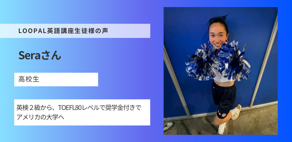 2025年12月28日 / 最終更新日時 : 2026年1月23日 MANA PARTNERS 体験談 LOOPAL英語講座 生徒の声:Sera Kunimotoさん 英検2級から、TOEFL80レベルで奨学金付きでアメリカの大学へ 英検2級レベルから、TOEFL80相当(Duolingo110)へ。Seraさんは、英語学習の方法そのものを見直すことで、英語力を大きく伸ばしました。 受講前は、過去問を解く以外の勉強法が分からず、半年以上努力しても成果 […]
