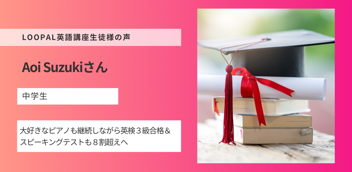 2026年1月22日 / 最終更新日時 : 2026年1月22日 MANA PARTNERS 体験談 LOOPAL英語講座 生徒の声:Aoi Suzukiさん 大好きなピアノも継続しながら英検3級合格&スピーキングテストも8割超えへ ピアノに本気で向き合いながらも、英語力もしっかり伸ばしたい。そんな思いを持ってLOOPAL英語講座を受講した Aoi Suzukiさん。 限られた時間の中で学習を続け、英検3級に一発合格、さらに学校のスピーキングテストで […]