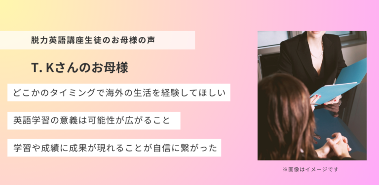 「オンライン学習&時間を効率的に使って成績アップ!メンターの存在がモチベーションに繋がり、毎日の学習習慣が身に付いた!」脱力英語講座生徒の親御様の声(T.Kさんのお母様)