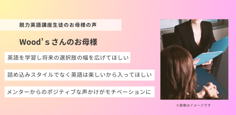 「メンターからのポジティブな声かけで学習習慣が定着!無理せず自分のペースで進められて、英語力も自信もアップ!」脱力英語講座生徒の親御様の声(Wood‘sさんのお母様)
